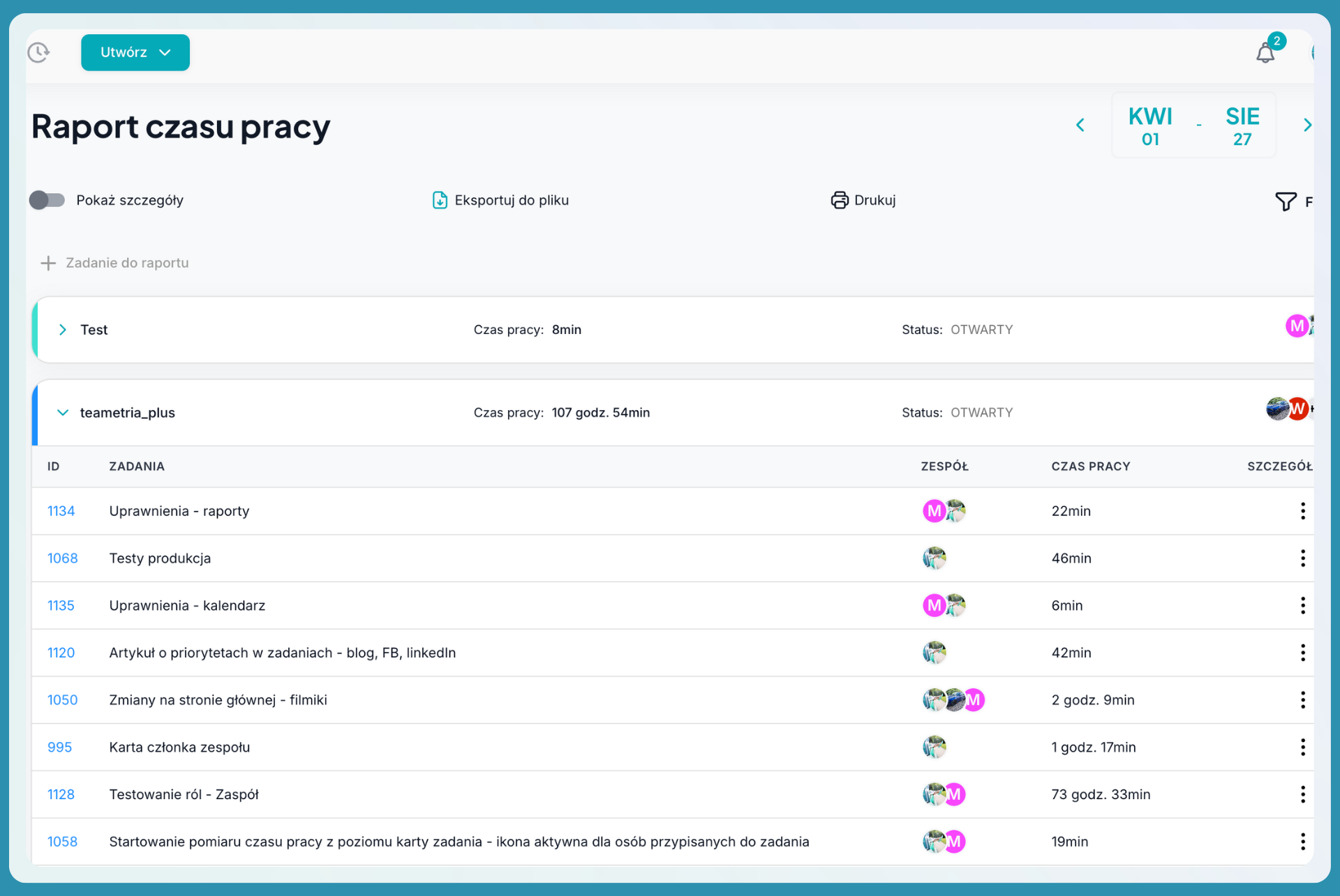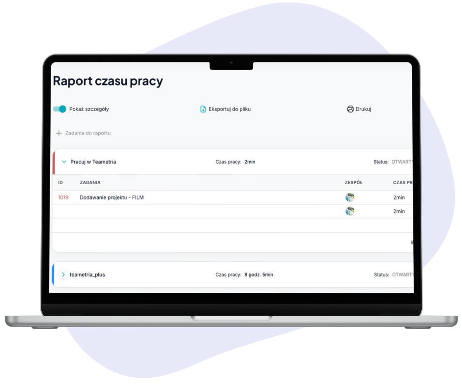 Podsumowanie czasu i zadań w jednym kliknięciu. Idealne do rozliczeń i kontroli efektywności.