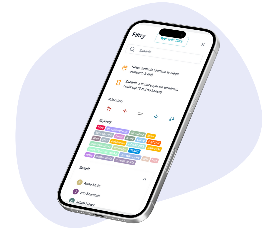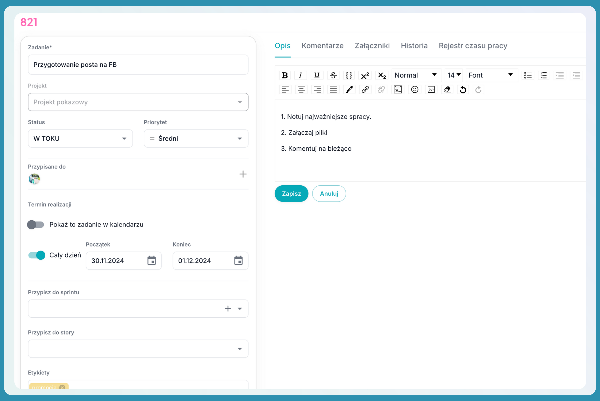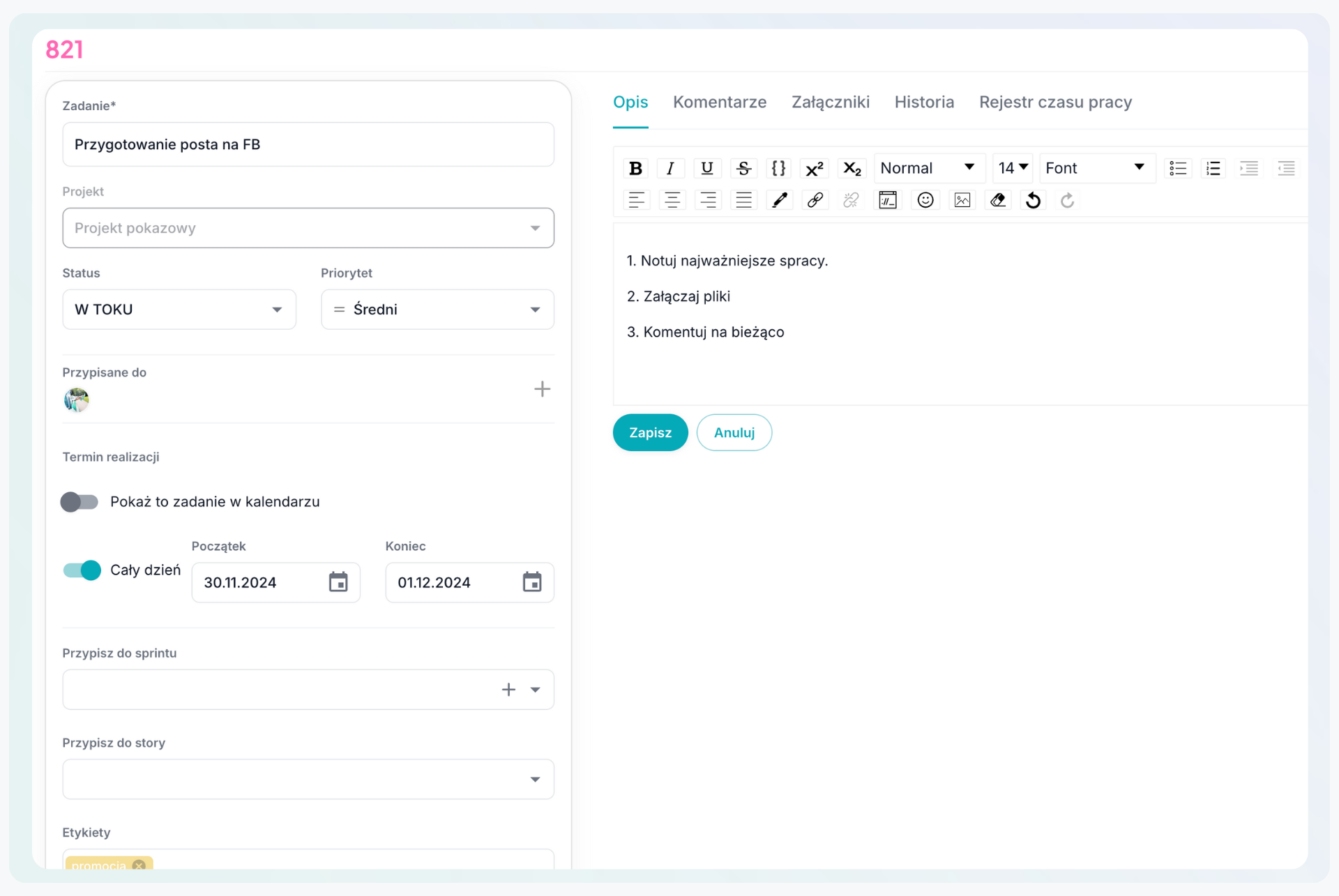 Twórz zadania w kilka sekund. Priorytety, statusy i terminy — przejrzyście dla całego zespołu.