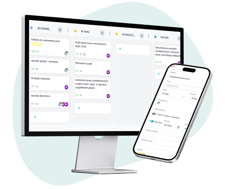 Twórz zadania, mierz czas pracy, dziel się obowiązkami z zespołem i kontroluj postępy. Czytelny interfejs po polsku i angielsku sprawi, że każdy wie co i kiedy zrobić