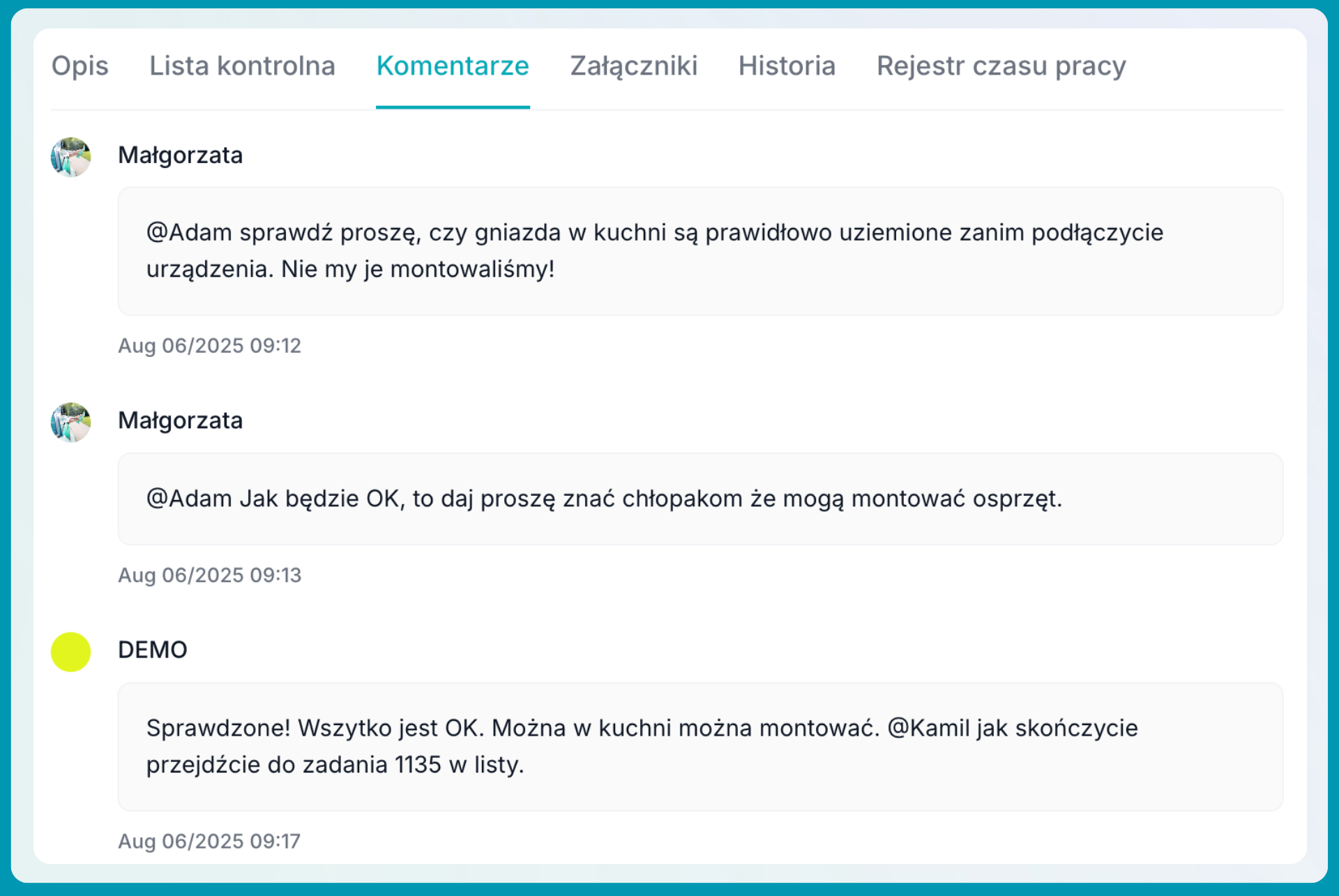 Każde zadanie ma swój czat — pytaj, odpowiadaj i obserwuj, co się dzieje bez gubienia się w mailach.