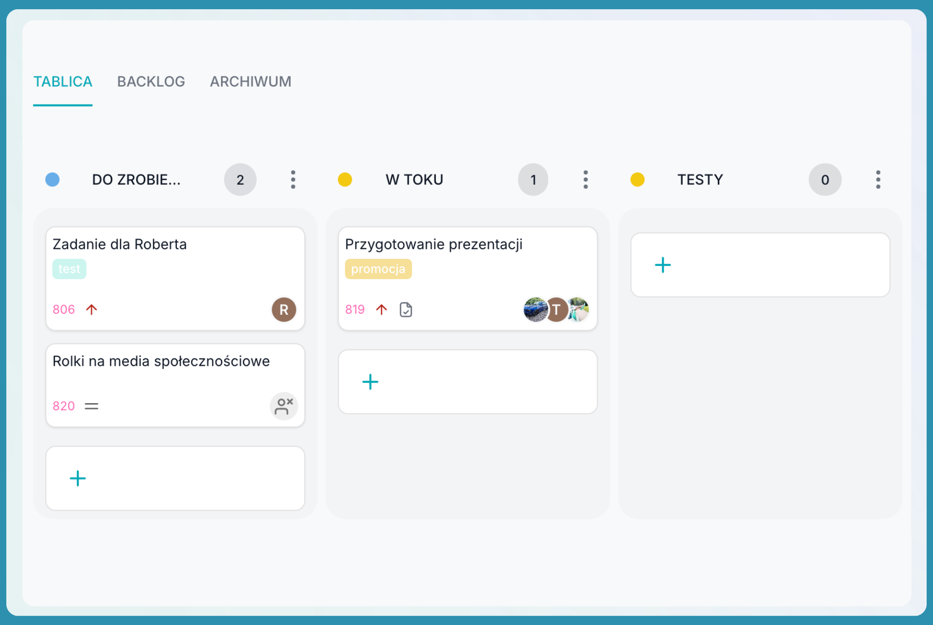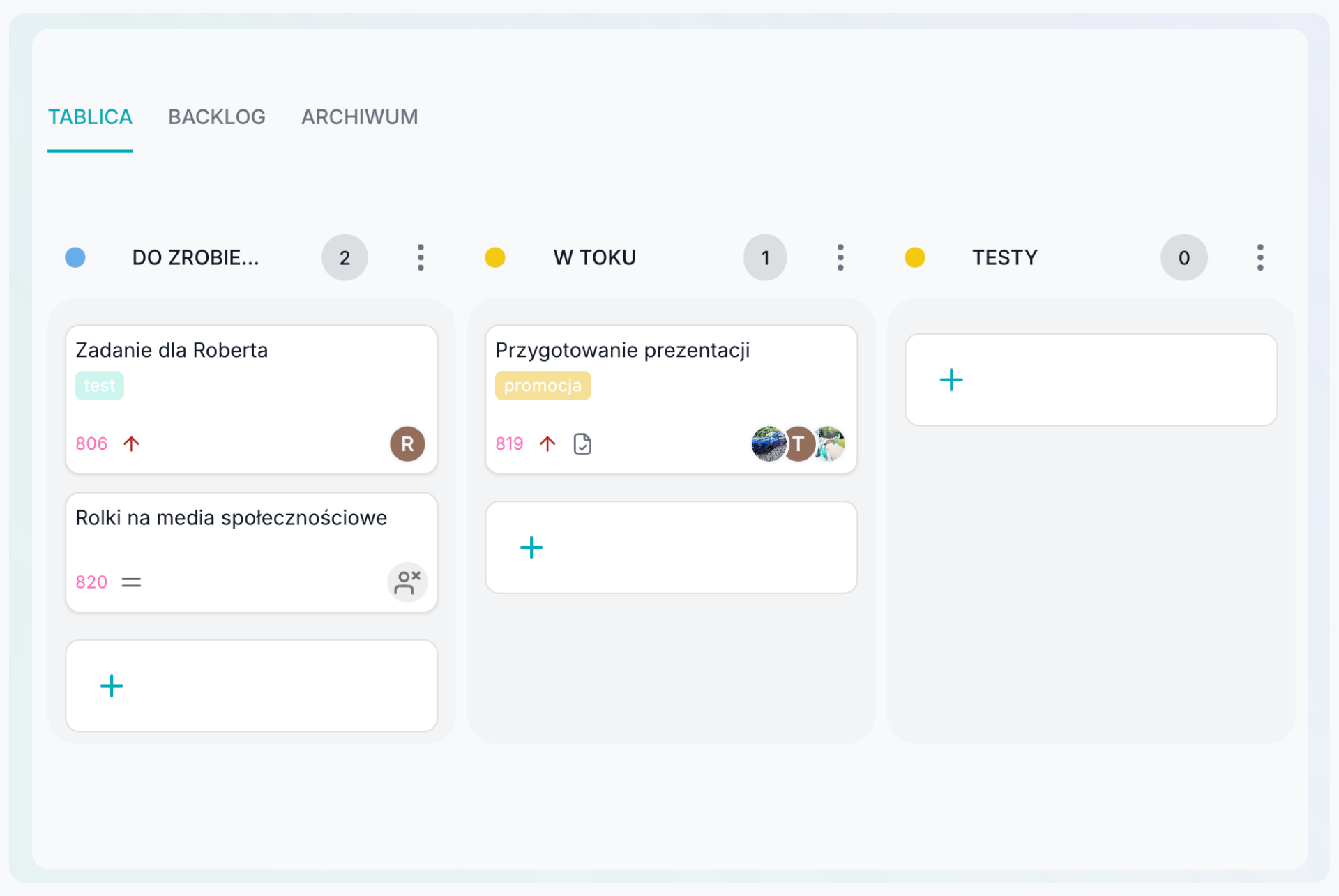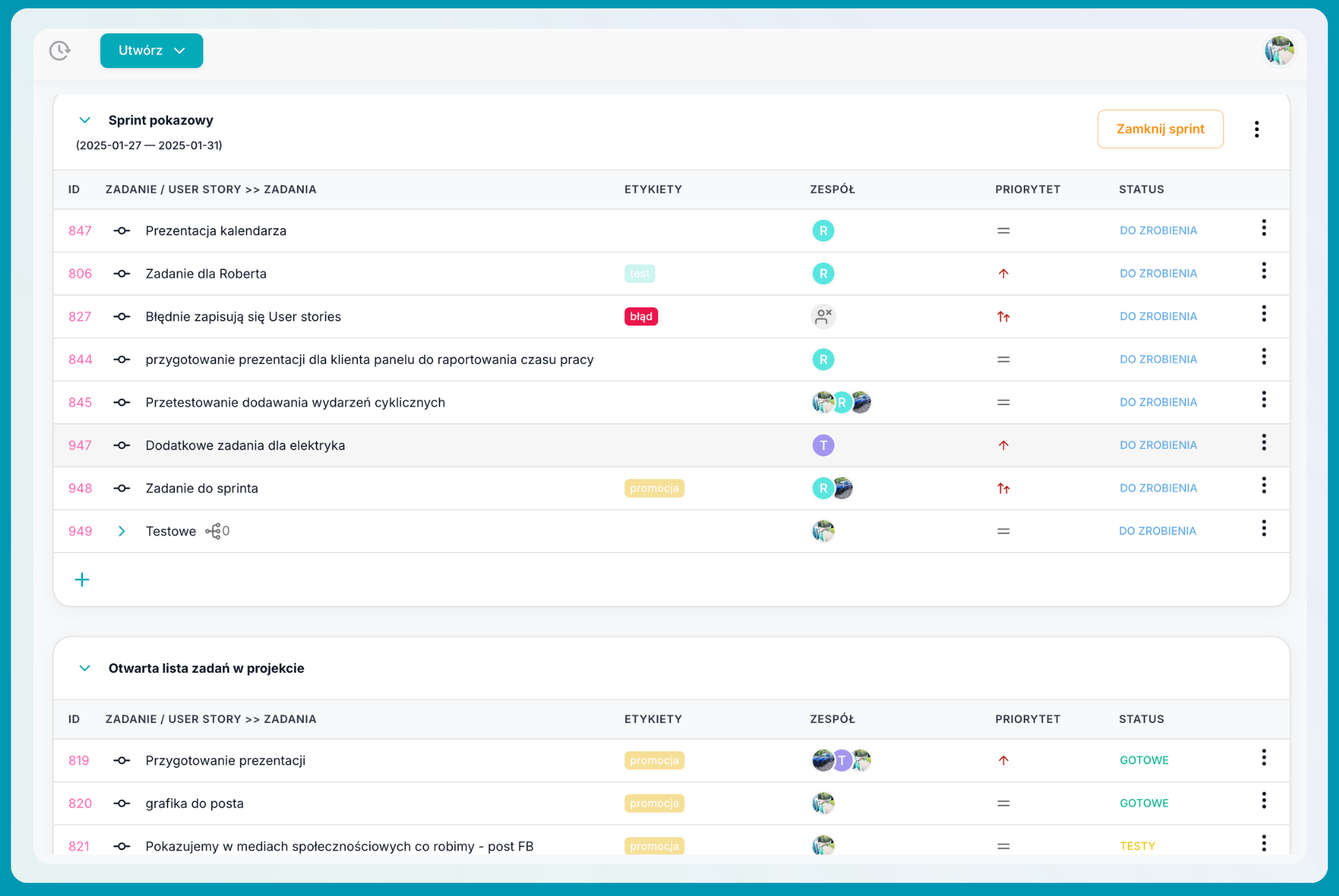 Zadania z aktywnego Sprintu trafiają na tablicę. Widzisz od razu, co jest do zrobienia, w toku i ukończone
