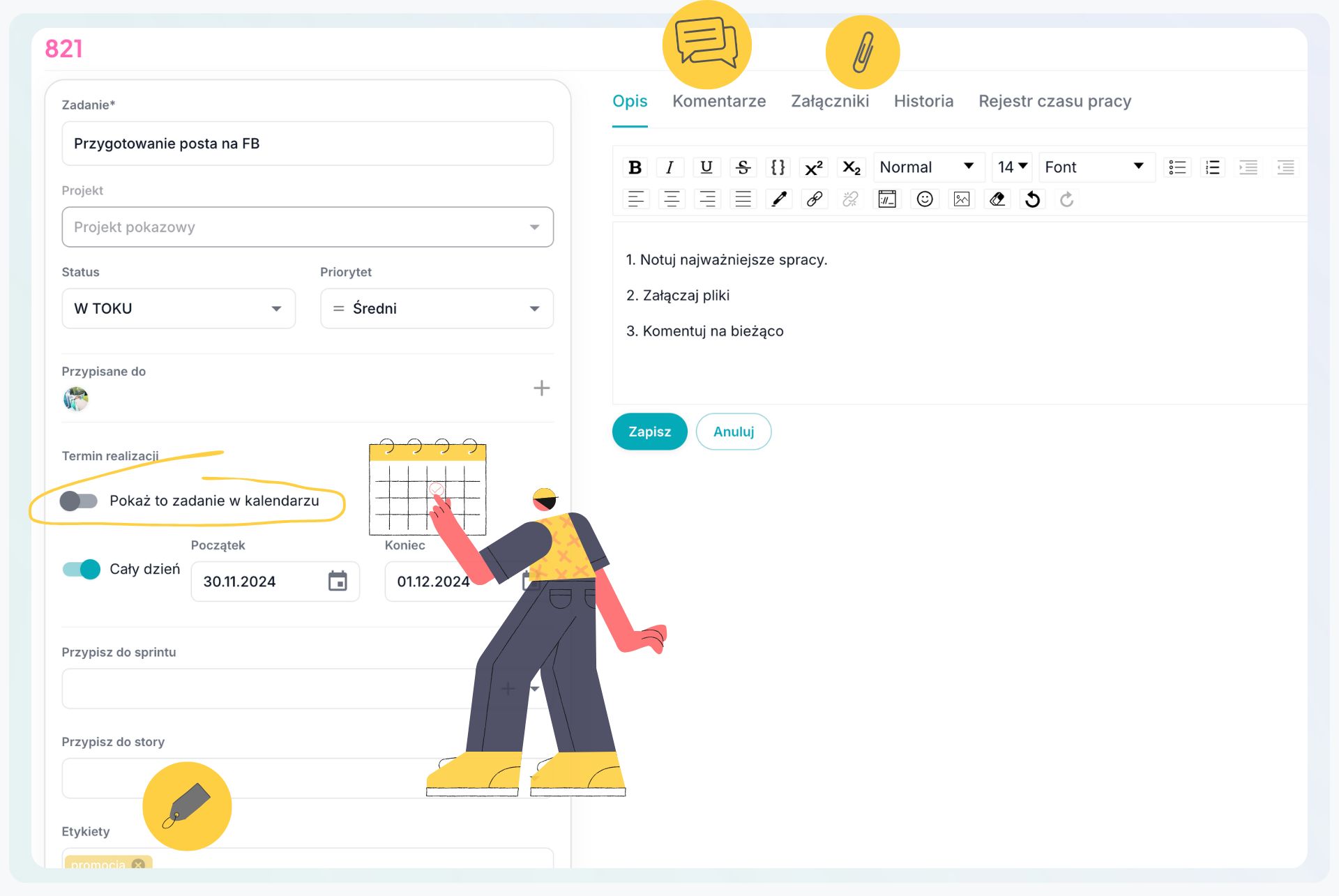 Komentarze, załączniki i statusy w zadaniach – każdy zawsze wie, co robić.