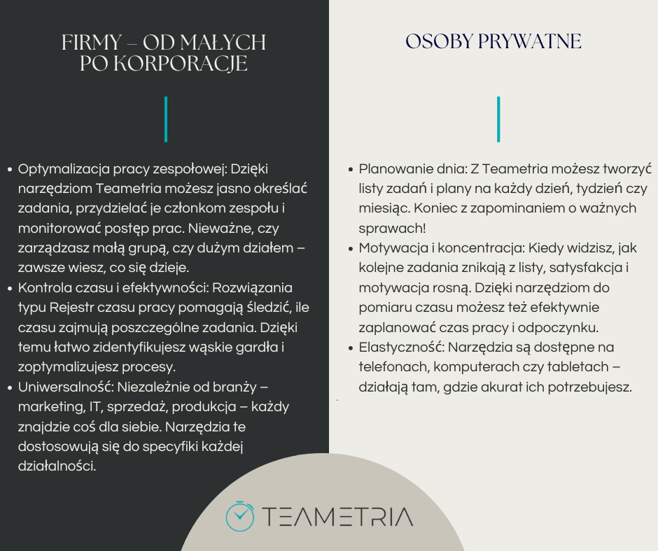Nie czekaj! Zacznij korzystać z narzędzi typu Teametria, które ułatwią Ci życie i pracę. Organizacja jeszcze nigdy nie była tak prosta i przyjemna.