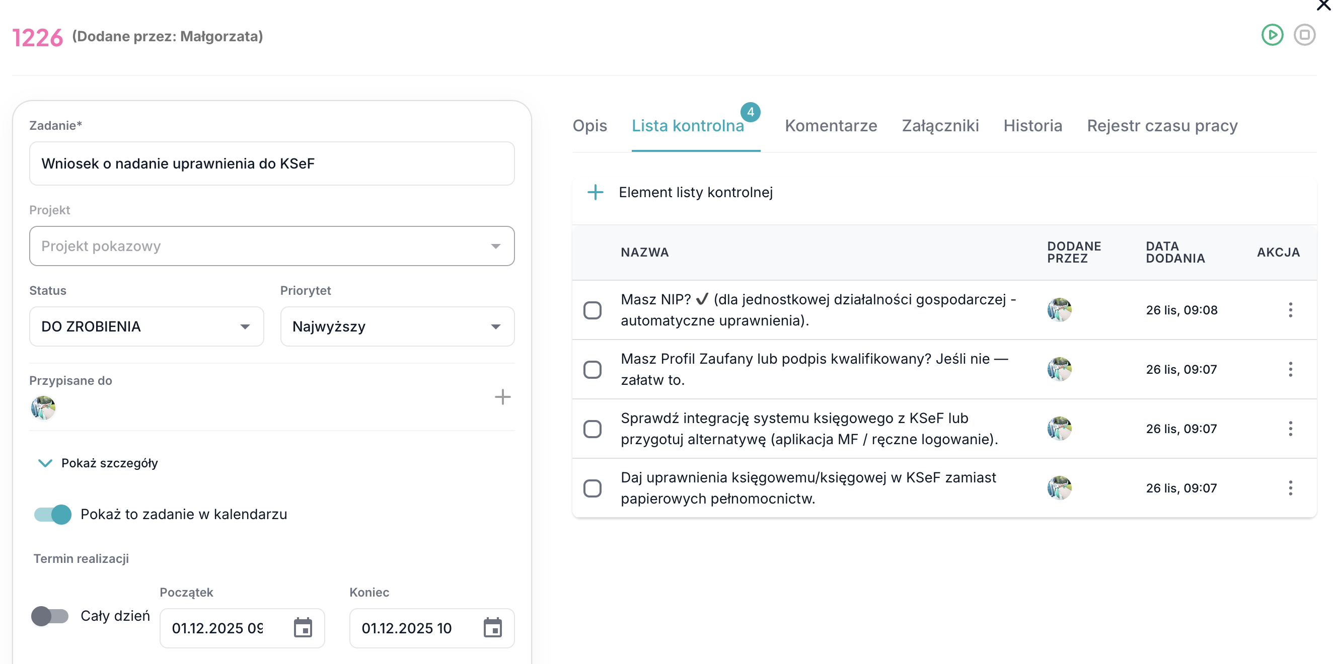 Checklista Teametria – co dopilnować dziś (krótko) – zapisz sobie/księgowej/astystentki zadanie w teametria.com z checklistą – i nic Wam nie umknie.